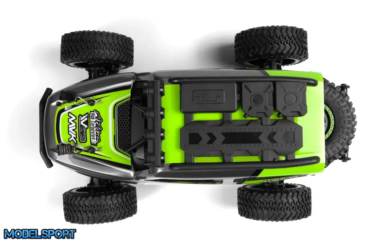 Trucken er udstyret med karrosseri farve matchede støddæmpere, en motorkøleplade til effektiv køling og indviklet detaljerede hjul, der bidrager til både ydeevne og æstetik. Drevet af en optimeret motor i 370 størrelse, leverer DOHA en imponerende tophastighed og acceleration. Den farvekoordinerede heatsink sikrer yderligere pålidelig ydeevne under længere tids brug.