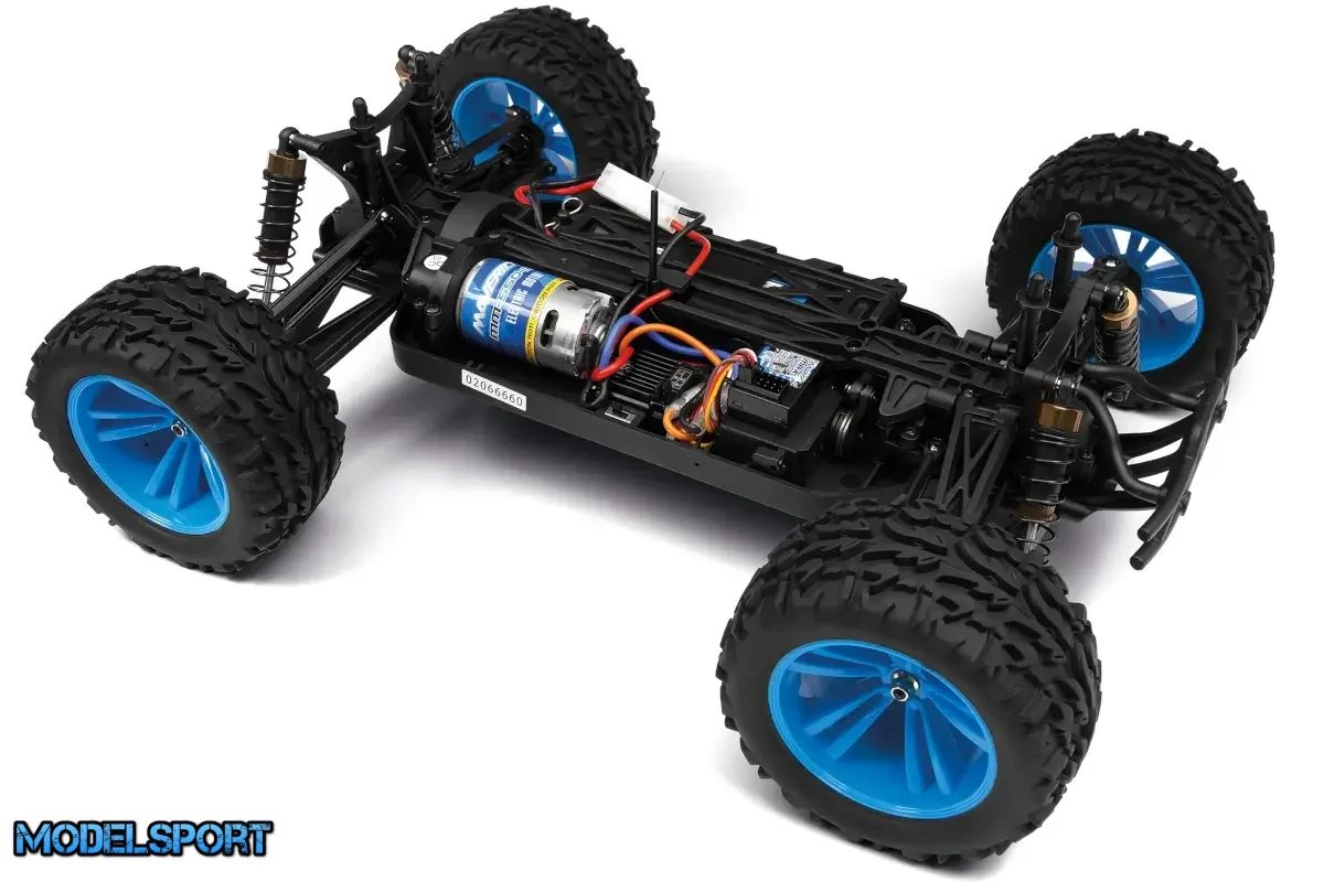Et robust støbt kar chassis og stærk affjedring støbt i nylonplast for den ideelle balance mellem styrke, fleksibilitet og holdbarhed. Kraften fra motoren leveres via en midteraksel af ståldrevdele, differentialer, bageste hundeknogler, forreste universaldrivaksler og aksler. Kraftig 7Kg servo er udstyret med en fjederbelastet beskyttelse i tilfælde af styrt.