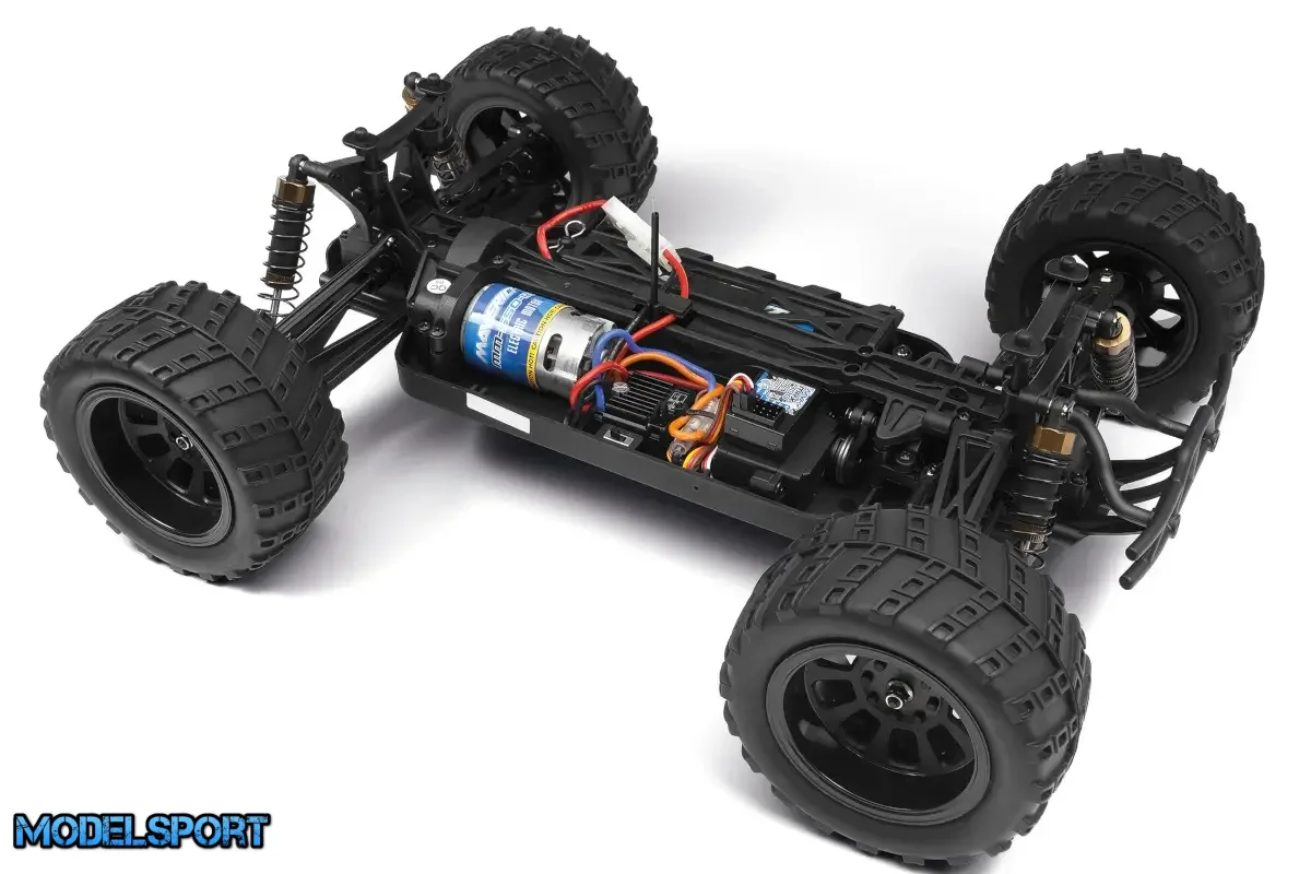 Et robust støbt kar chassis og stærk affjedring støbt i nylonplast for den ideelle balance mellem styrke, fleksibilitet og holdbarhed. Kraften fra motoren leveres via en midteraksel af ståldrevdele, differentialer, bageste hundeknogler, forreste universaldrivaksler og aksler. Kraftig 7Kg servo er udstyret med en fjederbelastet beskyttelse i tilfælde af styrt.