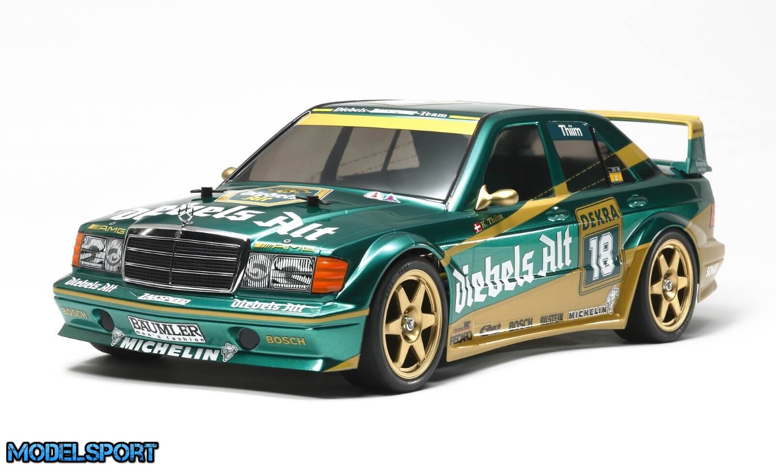 Dette kit inkluderer en præcist genskabt karrosseri af Mercedes-Benz 190E, komplet med bredere skærme og en frontspoiler for at give bilen et aggressivt udseende. De karakteristiske metalbelagte komponenter, der repræsenterer Mercedes-emblemet og frontgrillen, tilføjer et autentisk touch, og de separat støbte plastikdele gengiver side-spejlene. Medfølgende klistermærker gør det muligt at tilføje logoer, sponsordekorationer og bilnumre for at give bilen en troværdig udseende.