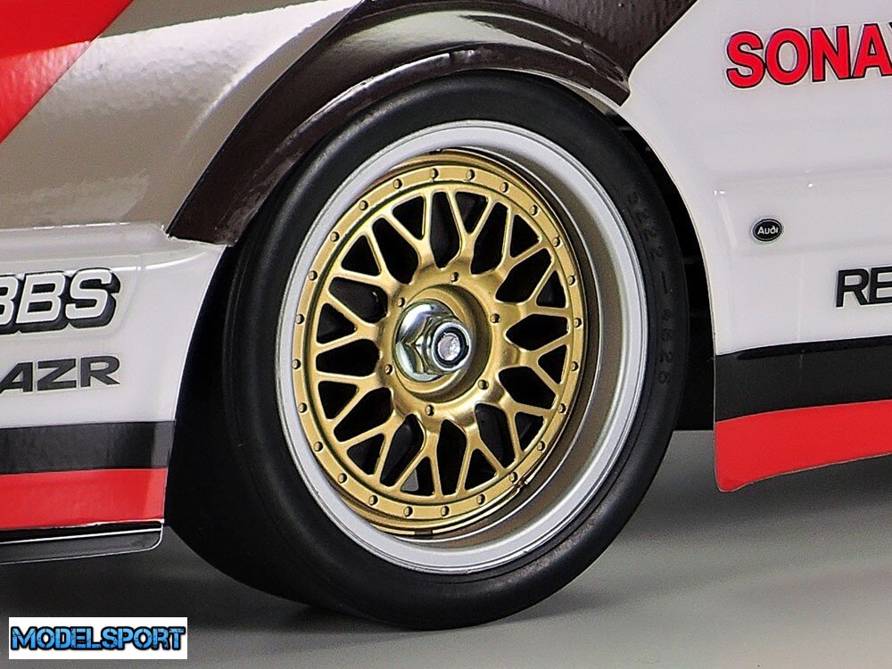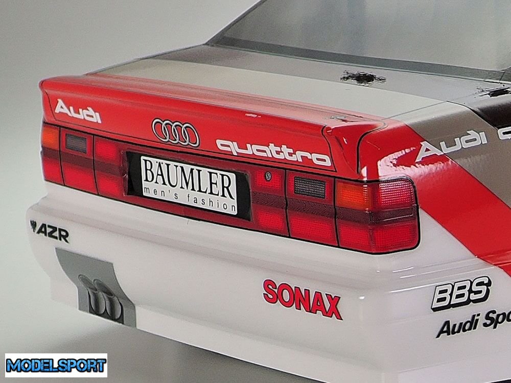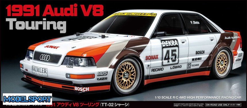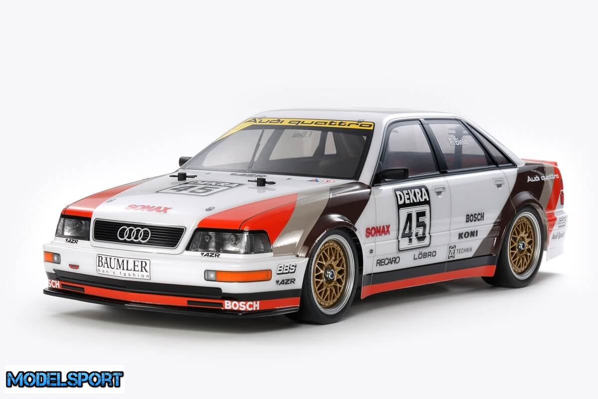 Dette Tamiya RC sæt genskaber den klassiske Audi DTM racerbil, som den blev kørt i løbet af DTM 1991 sæsonen. Audi V8 touring-bilen havde en 456 hk 3,6-liters V8, som prydede DTM (Deutsche Tourenwagen Masters) racerserien i Tyskland. I den sæson tog det fire sejre i alt og bragte Frank Biela til kørernes titel.