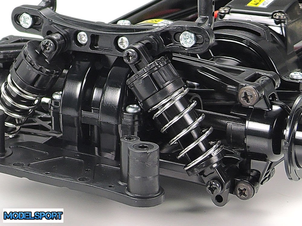 Det akseldrevne 4WD TT-02 chassis har et langsgående layout med batteriet til venstre og motoren til højre for at tilbyde fremragende stabilitet. Derudover har den identiske venstre og højre ophængsarme og stolper for nem montering, plus gearkasser, der er nemme at vedligeholde.
