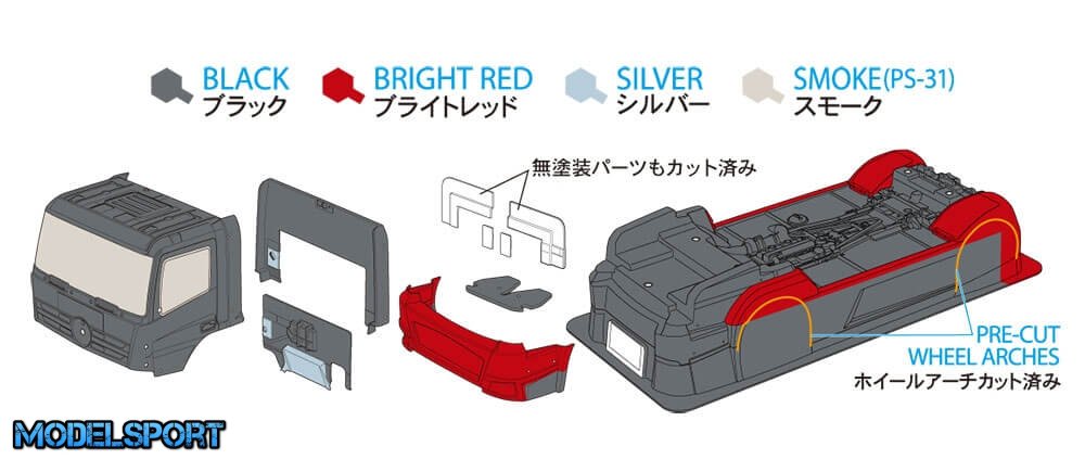 Det realistiske karosseri er et 3-delt sæt lavet af let og holdbart polycarbonat, med separat støbte plastiksidespejle, kobling og bagkofangerdele. Karrosseriet er monteret oven på det gennemprøvede TT-01 Type-E chassis og er udstyret med dedikerede semi-truck hjul og dæk til modellen.