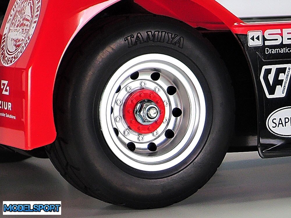 • Sølvfarvede støbte hjul og 70 mm diameter radialdæk er specielt designet til racerbilmodeller.