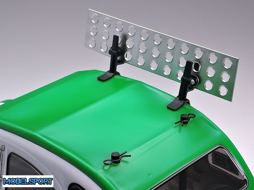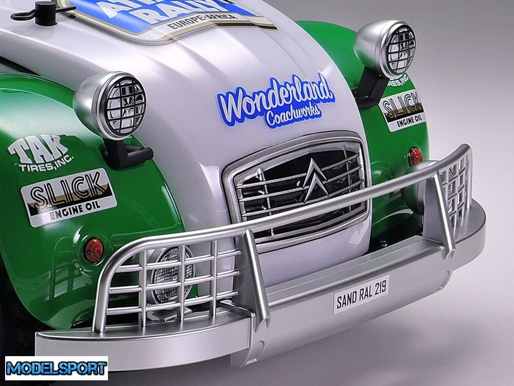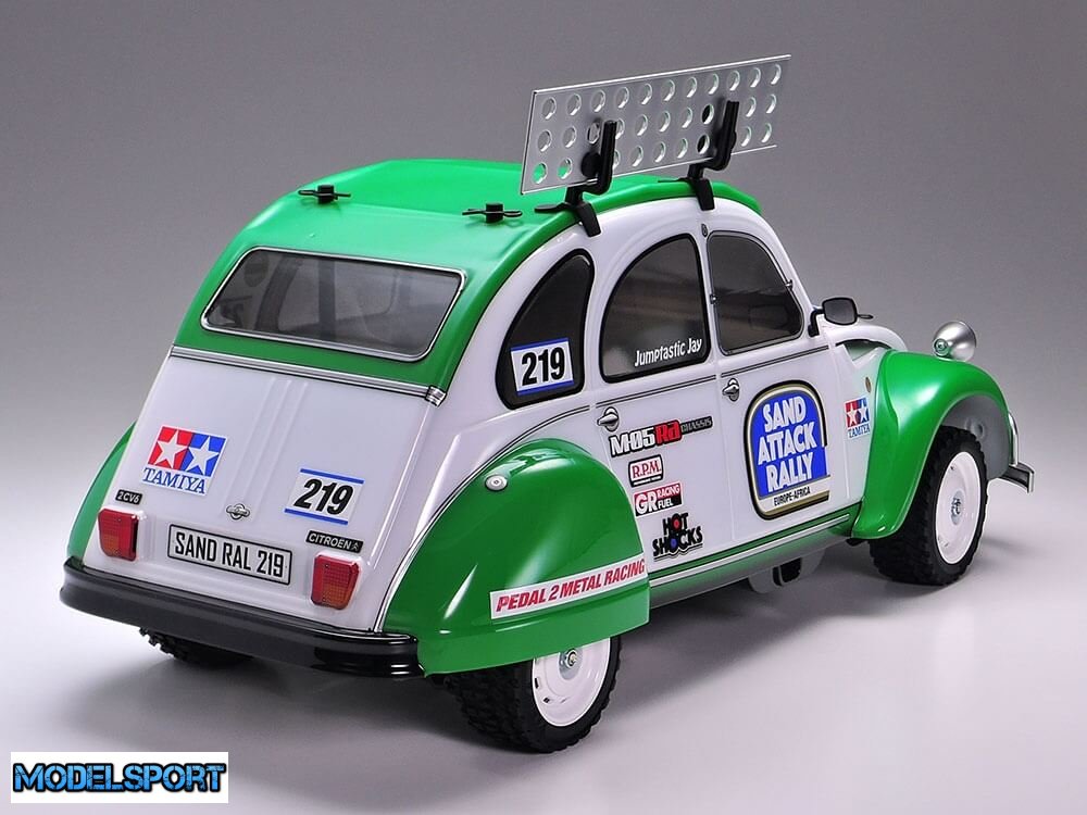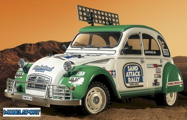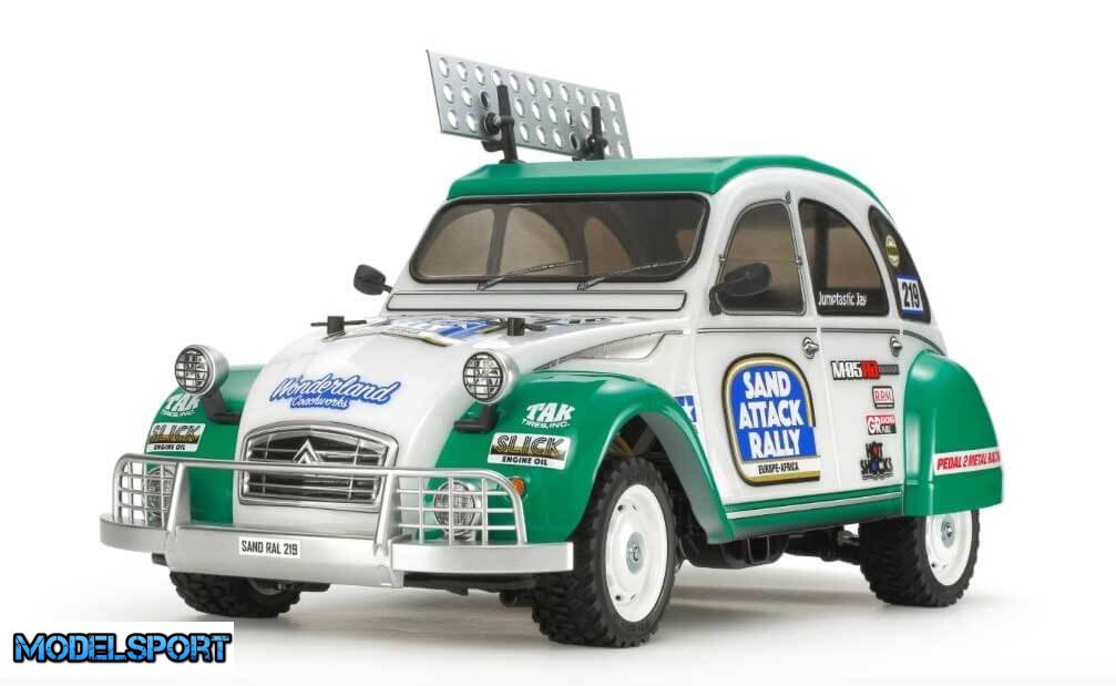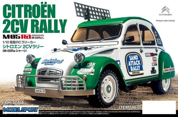 Dette TAMIYA RC model byggesæt viser Citroën 2CV. Sættet indeholder en yderst realistisk genskabelse af karosseriet, modificeret til rallyløb og baseret på et dedikeret rallychassis i form af M-05Ra.