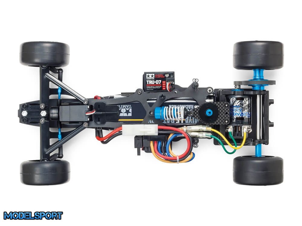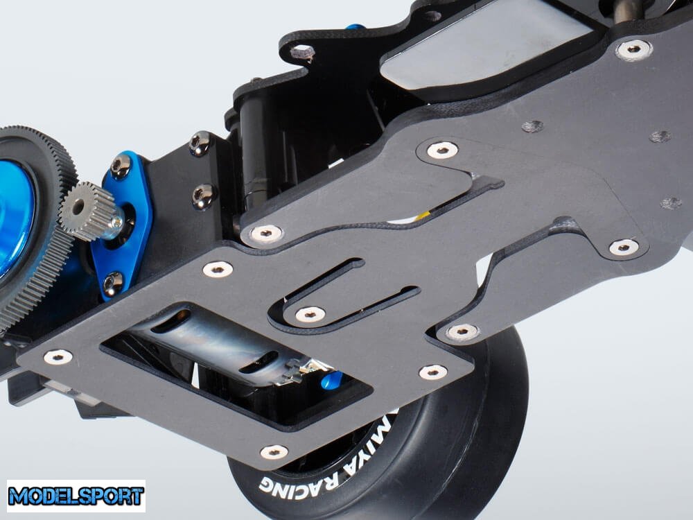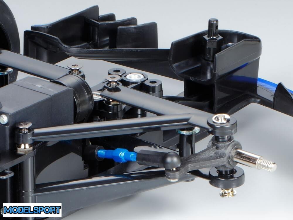 • Det 1,5 mm tykke FRP T-bar design med U-formet cutaway er arvet fra F104WGP. Den udgør baghjulsophænget sammen med friktionsplader og en TRF-dæmper.