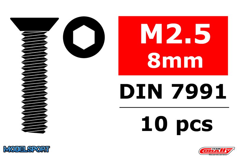 Team Corally - Steel Screws M2.5 x 8mm - Hex Flat Head - 10 pcs