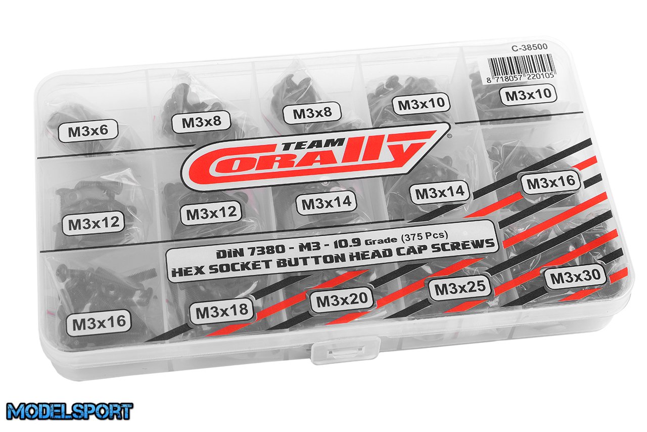 Team Corally - Screw Set M3 - Hex Button Head - DIN 7380 - Steel Black - 10.9 Grade - 15 Sizes - 375 pcs