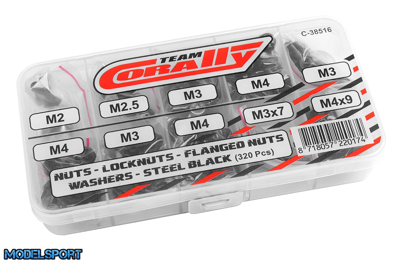 Team Corally - Nuts - Lock Nuts - Washers Set - M2 - M2.5 - M3 - M4 - Steel Black - 10 Sizes - 320 pcs