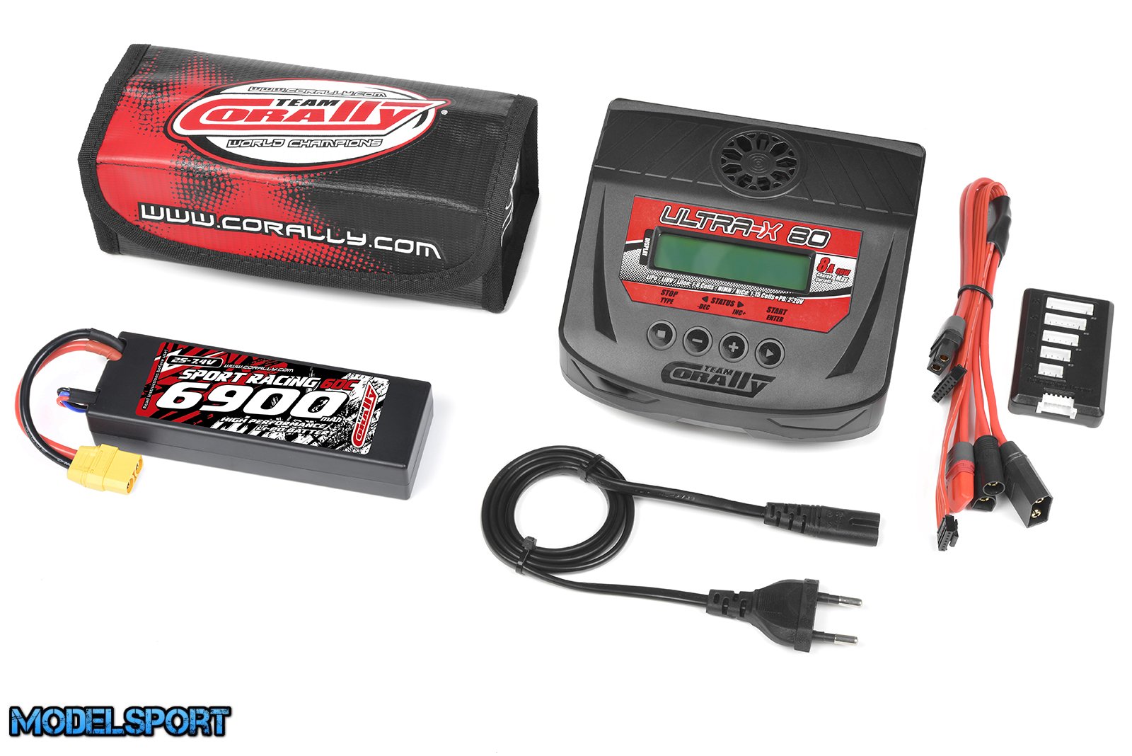 Team Corally - Energy Pack - Lipo 60C - 6900Mah - 2S - XT-90 - Hard Case + Ultra-X 80 - 1-6S AC/DC Charger + Lipo Safety Bag + Charge-Balance Lead