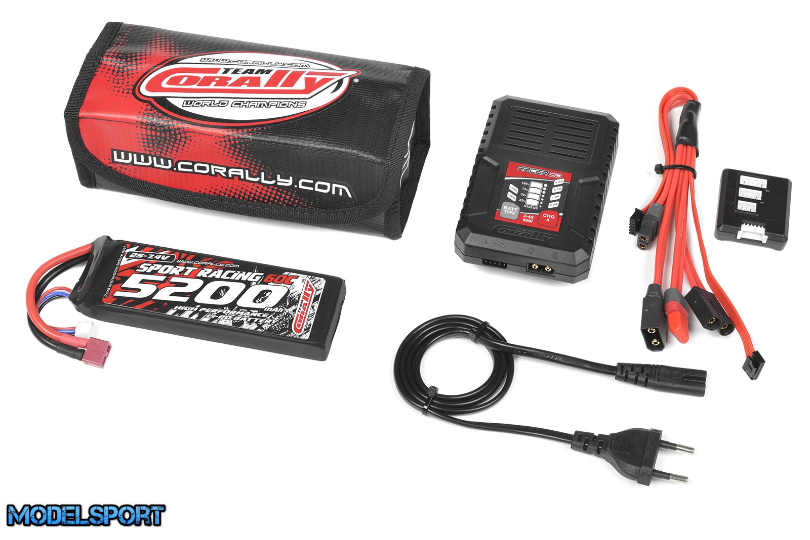 Team Corally - Energy Pack - Lipo 60C - 5200MAH - 2S - T-Plug - Semi-Soft Case + Racer 50 - 2-4S AC Charger + Lipo Safety Bag + Charge-Balance Lead