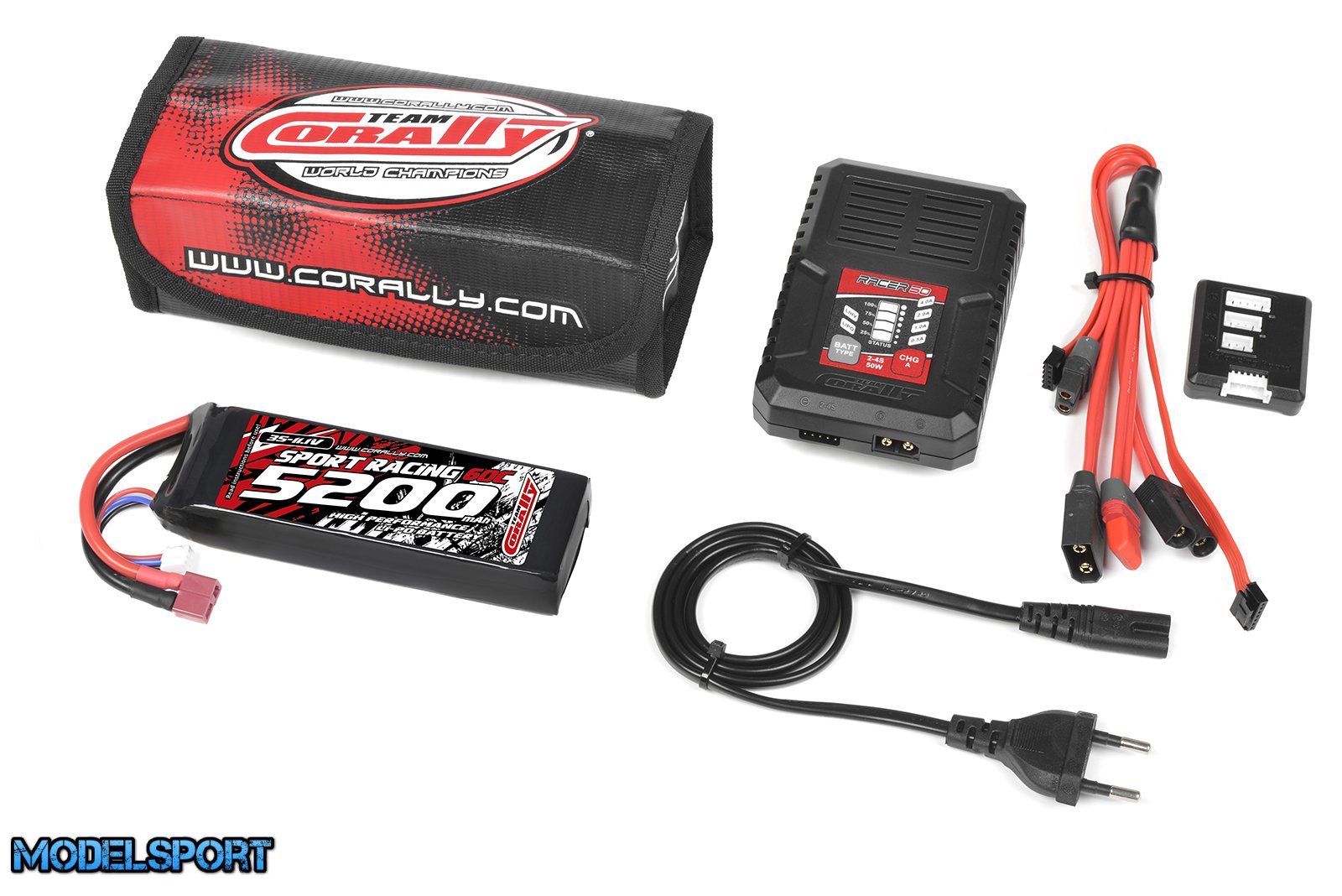 Team Corally - Energy Pack - Lipo 60C - 5200MAH - 3S - T-Plug - Semi-Soft Case + Racer 50 - 2-4S AC Charger + Lipo Safety Bag + Charge-Balance Lead
