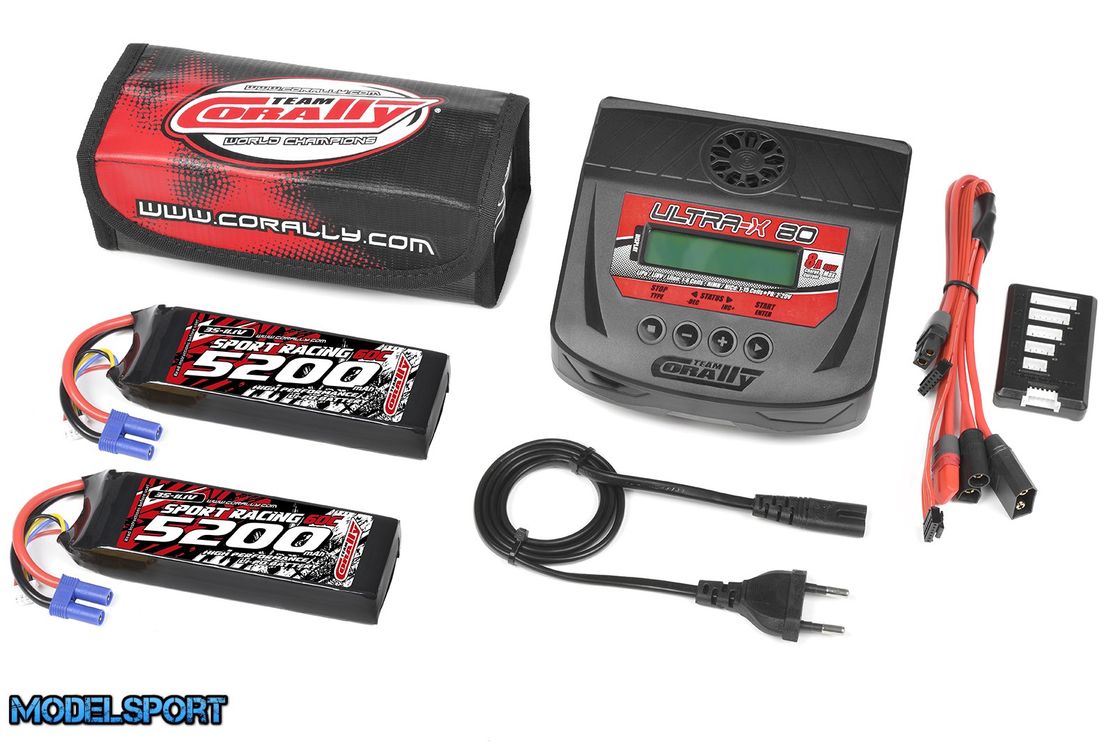 Team Corally - Energy Pack - 2X Lipo 60C - 5200MAH - 3S - EC-5 - Semi-Soft Case + Ultra-X 80 - 1-6S AC/DC Charger + Lipo Safety Bag + Charge-Balance Lead