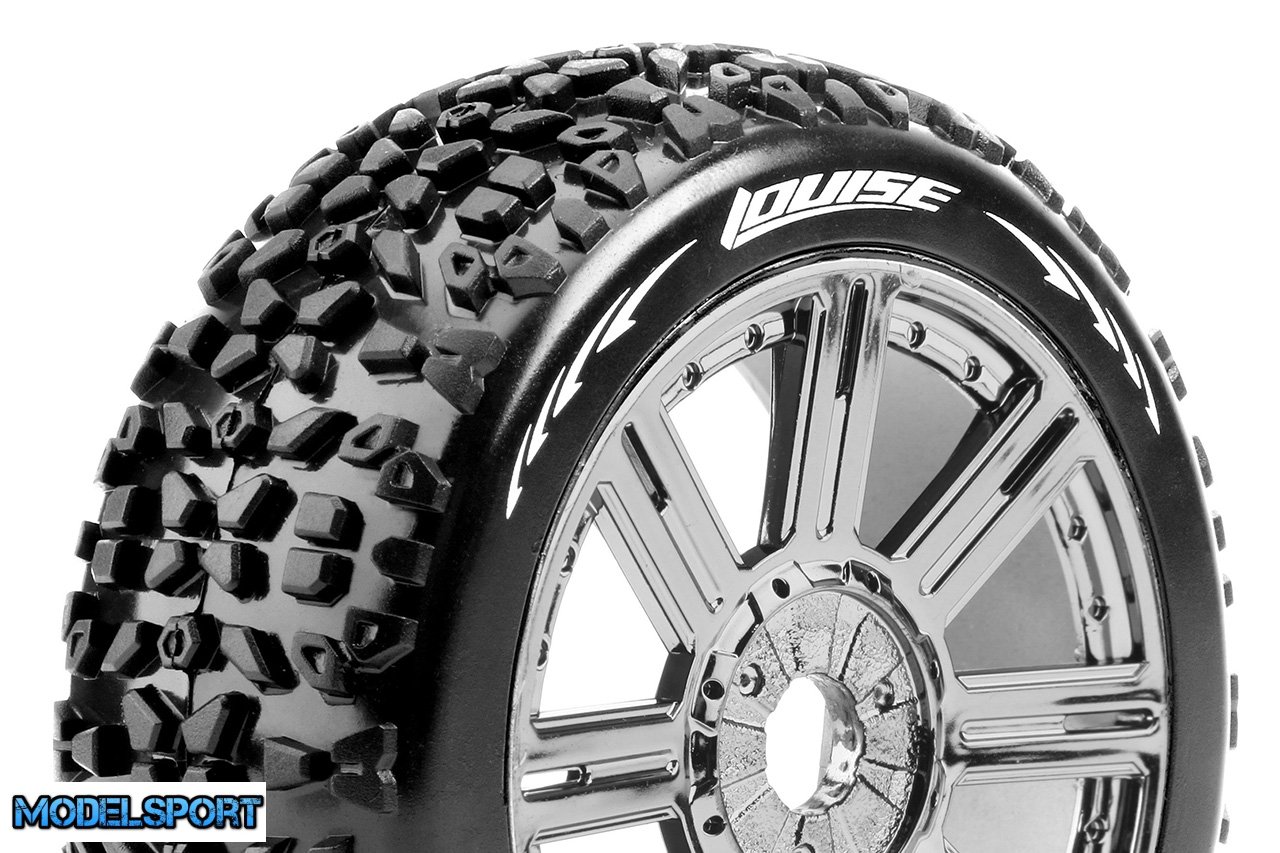 Louise RC - B-MAZINGER - 1-8 Buggy Tire Set - Mounted - Soft - Black-Chrome Spoke Wheels - Hex 17mm - L-T3108SBC