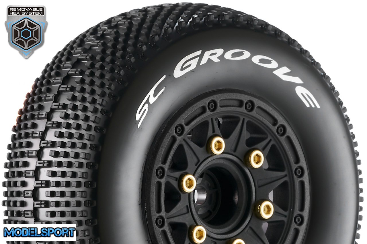 Louise RC - SC-GROOVE - 1-10 Short Course Tire Set - Mounted - Soft - Black Wheels - Removable 1-10 SC Hex - 12, 14, 17mm - L-T3146SB