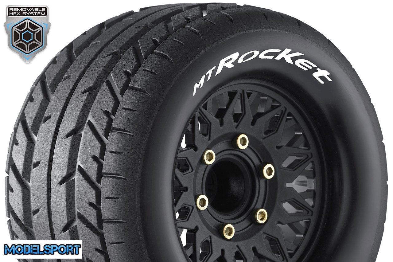 Louise RC - MT-ROCKET - 1-10 Monster Truck Tire Set - Mounted - Sport - Black Wheels - Removable HEX 12 Narrow, 12 Wide, 14, 17mm - L-T3201SX