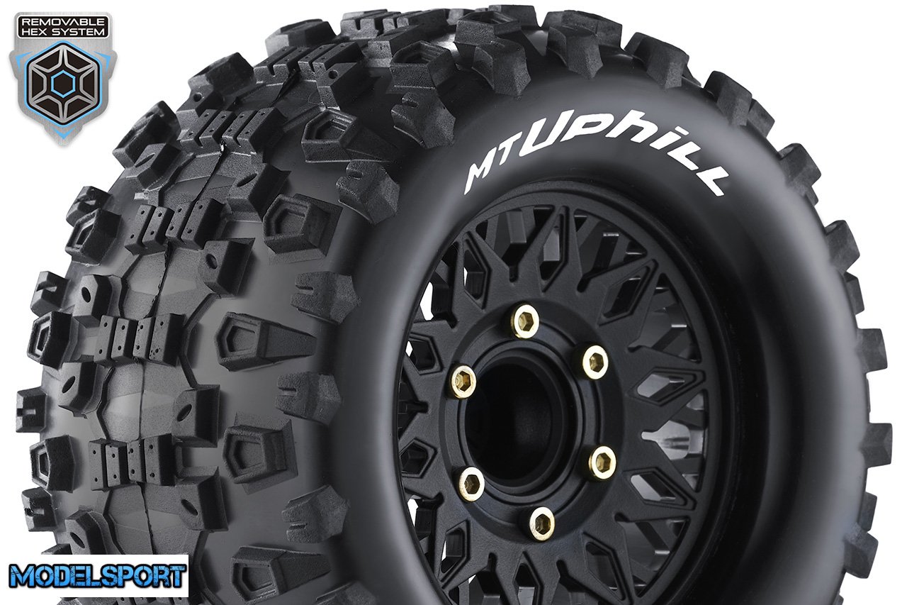 Louise RC - MT-UPHILL - 1-10 Monster Truck Tire Set - Mounted - Sport - Black Wheels - Removable HEX 12 Narrow, 12 Wide, 14, 17mm - L-T3204SX