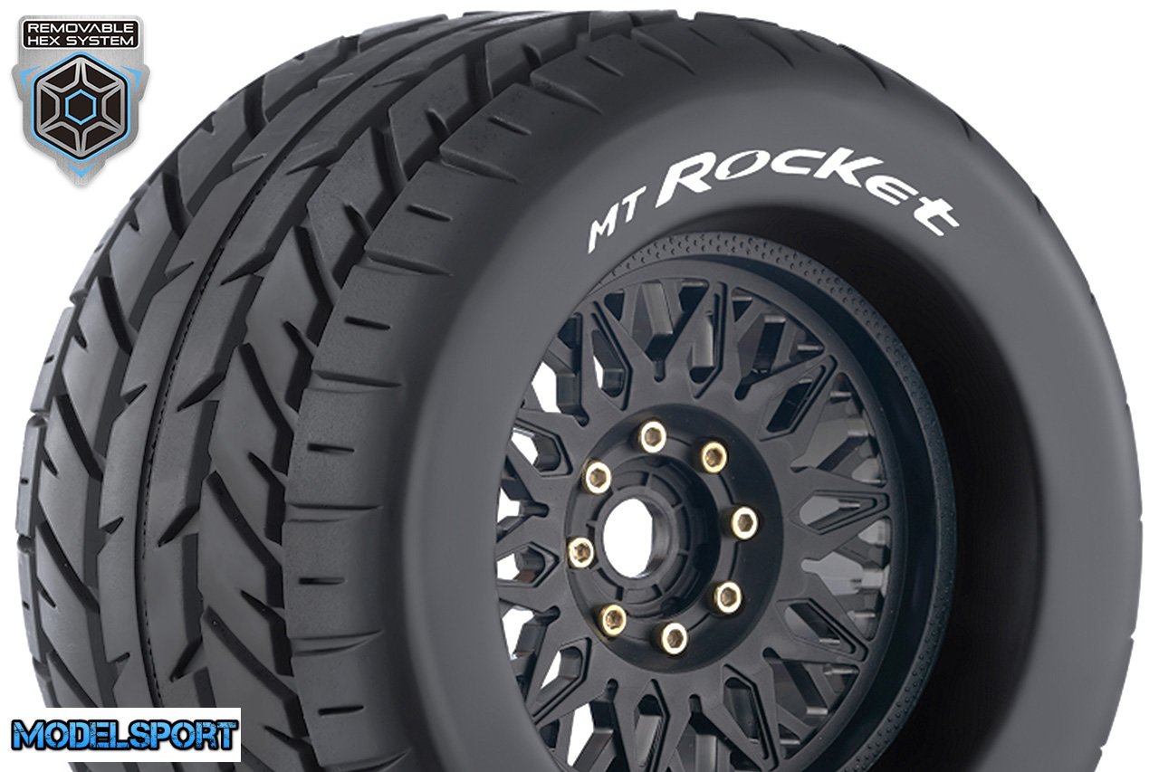 Louise RC - MT-ROCKET - 1-8 Monster Truck Tire Set - Mounted - Sport - Black Wheels - Removable 0" & 1/2" OFFSET HEX 17mm - L-T3217X