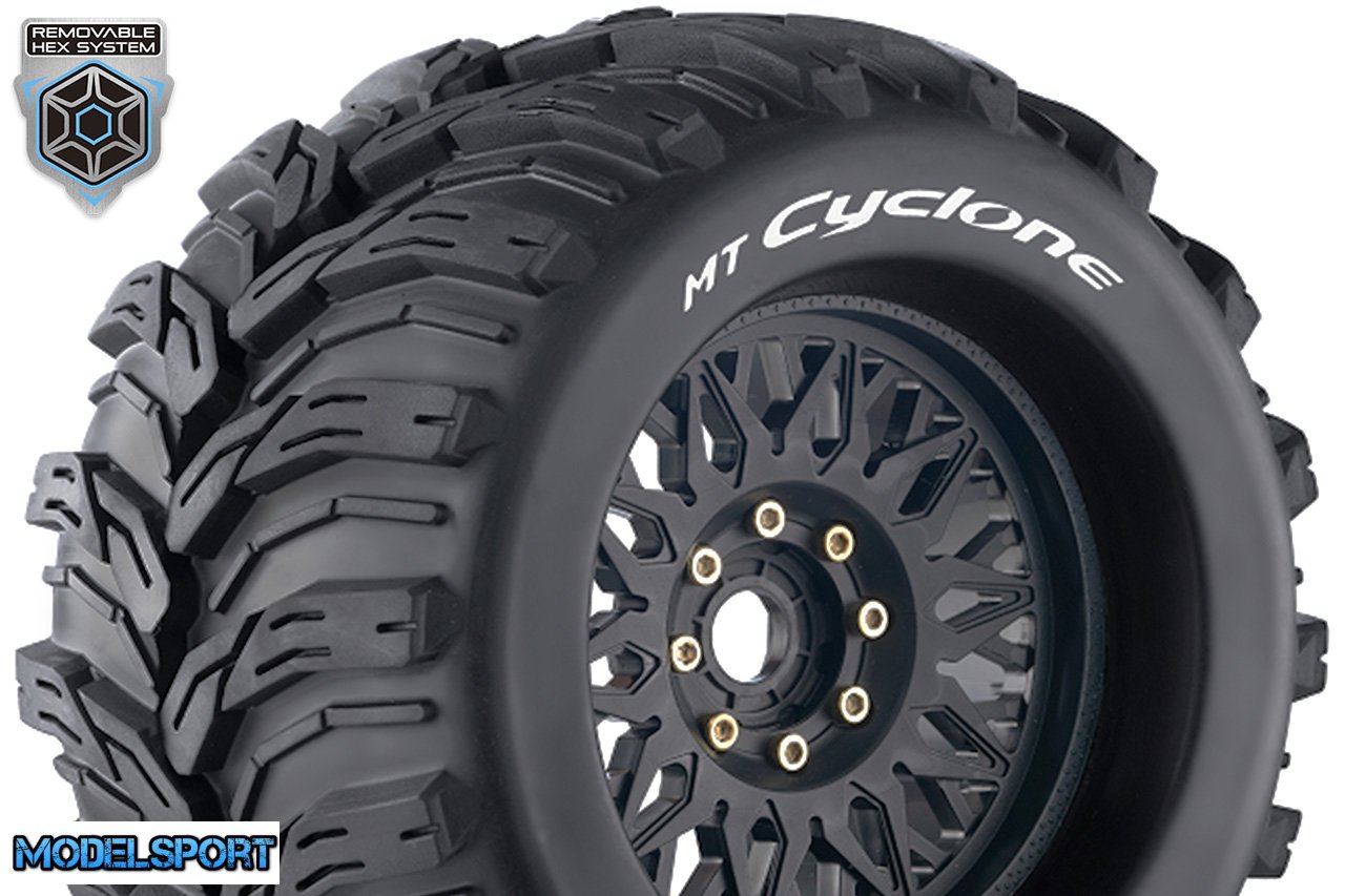 Louise RC - MT-CYCLONE - 1-8 Monster Truck Tire Set - Mounted - Sport - Black Wheels - Removable 0" & 1/2" OFFSET HEX 17mm - L-T3220X