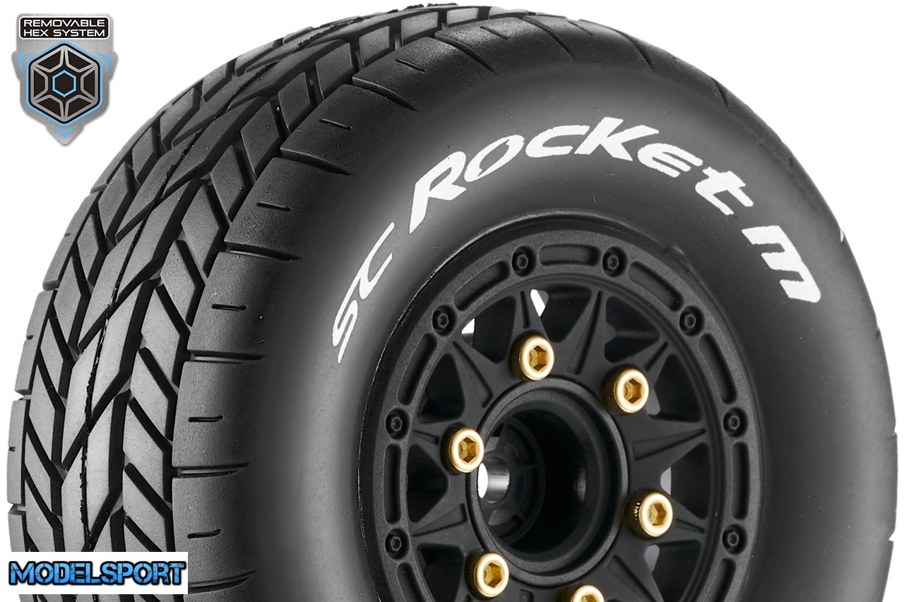 Louise RC - SC-ROCKET M - 1-10 Short Course Tire Set - Mounted - Soft - Black Wheels - Removable 1-10 SC Hex - 12, 14, 17mm - L-T3228SB