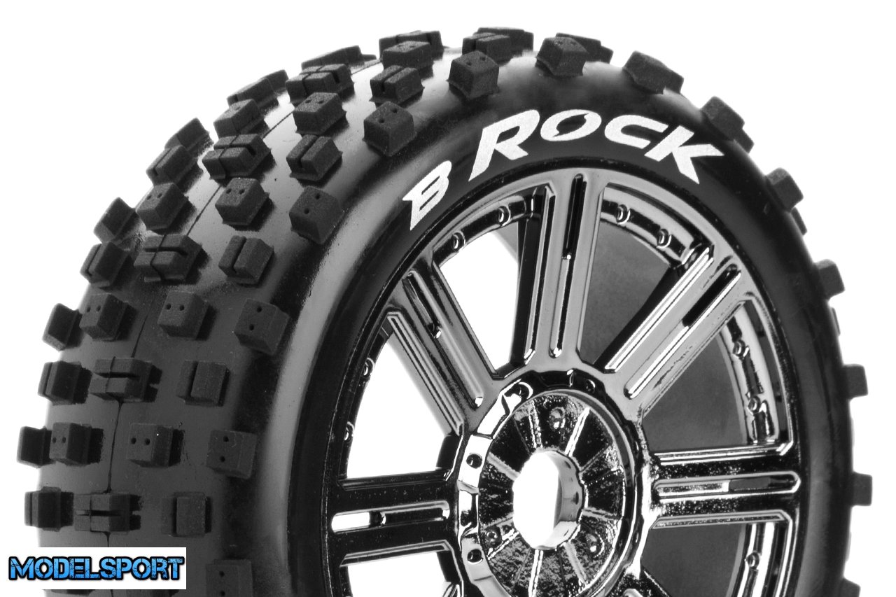 Louise RC - B-ROCK - 1-8 Buggy Tire Set - Mounted - Soft - Black-Chrome Spoke Wheels - Hex 17mm - L-T3270SBC