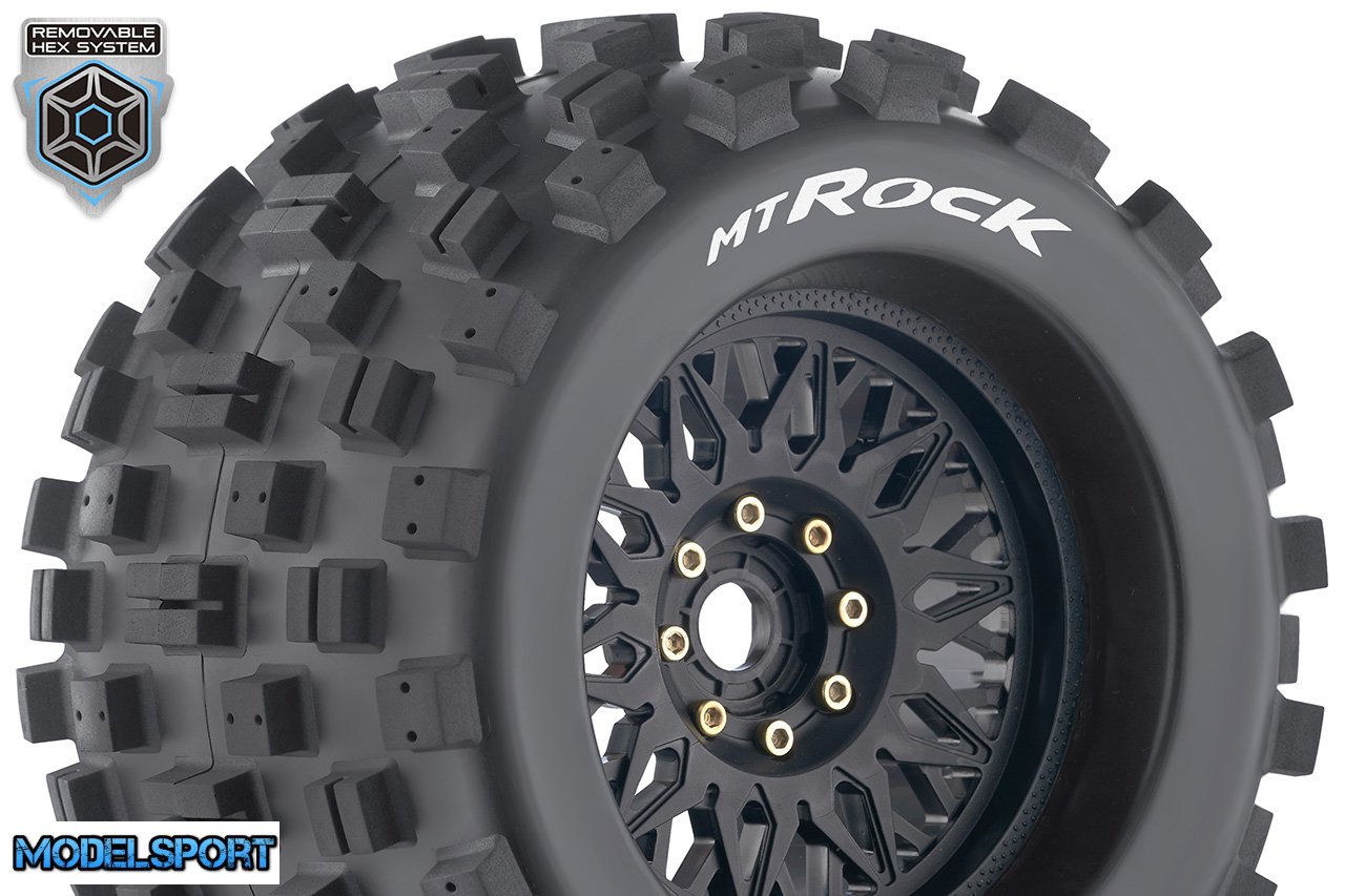 Louise RC - MT-ROCK - 1-8 Monster Truck Tire Set - Mounted - Sport - Black Wheels - Removable 0" & 1/2" OFFSET HEX 17mm - L-T3277X