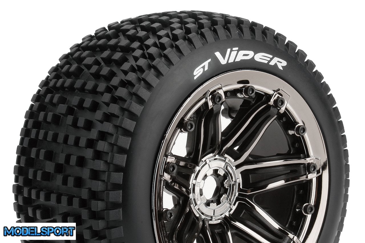Louise RC - ST-VIPER- 1-8 Stadium Truck Tire Set - Mounted - Sport - Black Chrome 3.8 Bead Style Wheels - Hex 17mm - L-T3289BC