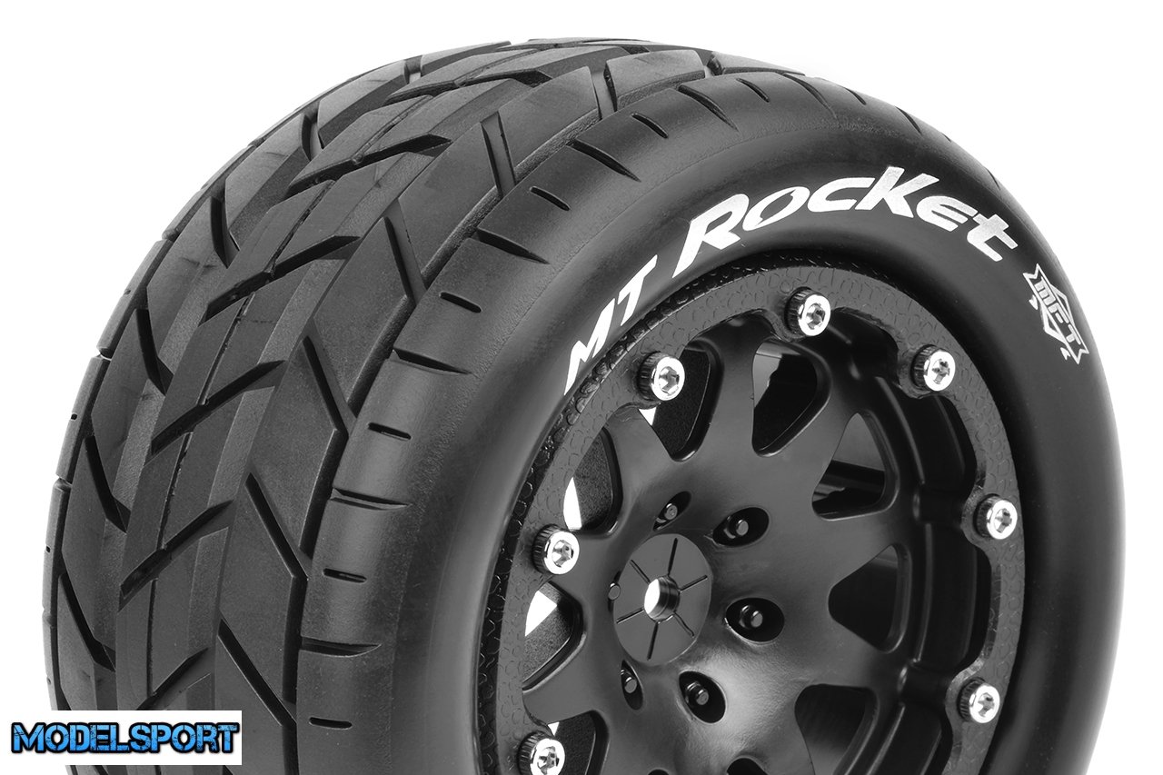 Louise RC - MFT - MT-ROCKET - 1-10 Monster Truck Tire Set - Mounted - Sport - Black 2.8 Bead-Lock Wheels - 0-Offset - Hex 12mm - L-T3307SB