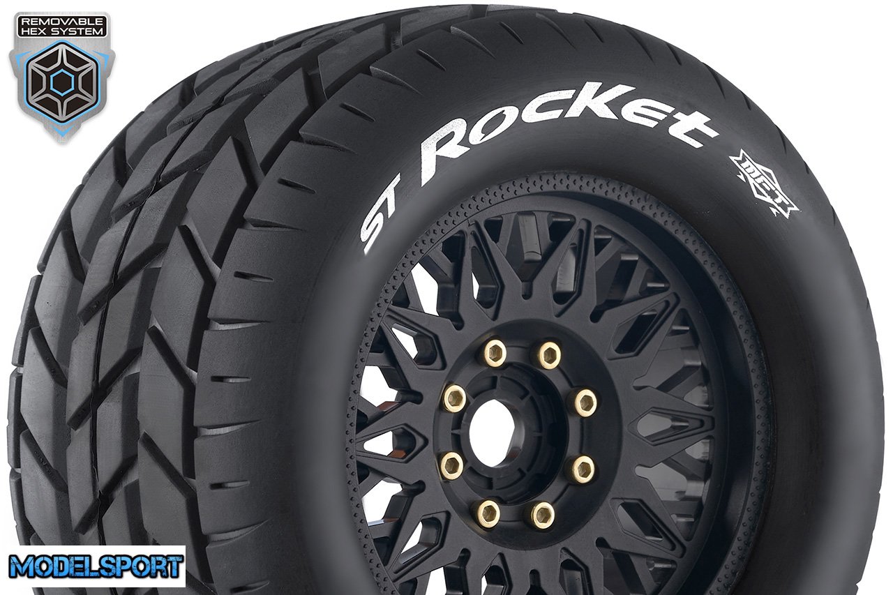 Louise RC - MFT - ST-ROCKET - 1-8 Stadium Truck Tire Set - Mounted - Sport - Black Wheels - Removable 0" & 1/2" OFFSET HEX 17mm - L-T3224X