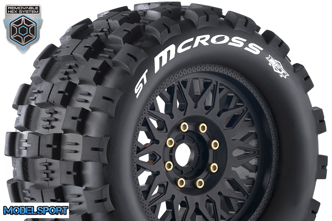 Louise RC - MFT - ST-MCROSS - 1-8 Stadium Truck Tire Set - Mounted - Sport - Black Wheels - Removable 0" & 1/2" OFFSET HEX 17mm - L-T3227X
