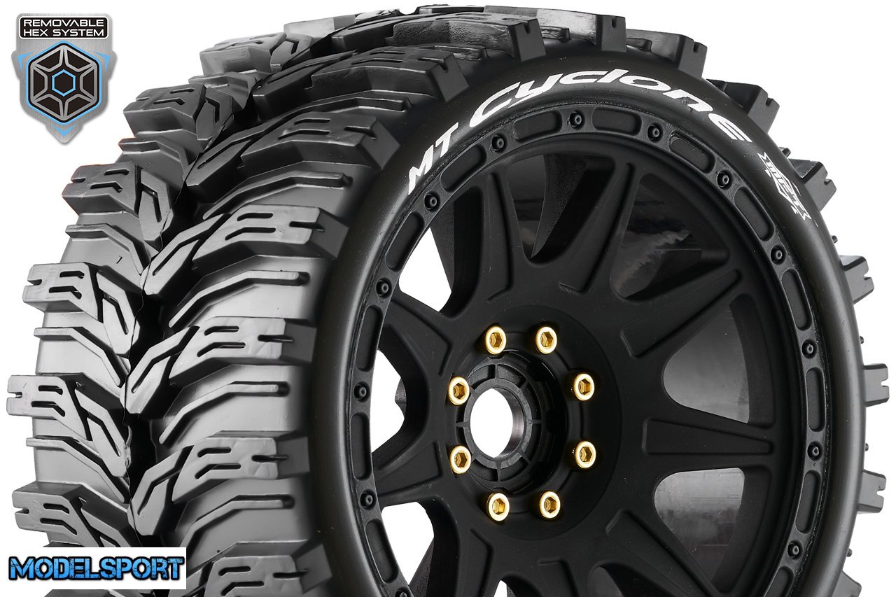 Louise RC - MFT - MT-CYCLONE speed - 1-8 Monster Truck Tire Set - Mounted - Soft - Black Wheels - Removable 1-8 MT HEX 17mm - 0" & 1/2" OFFSET - L-T3356SB