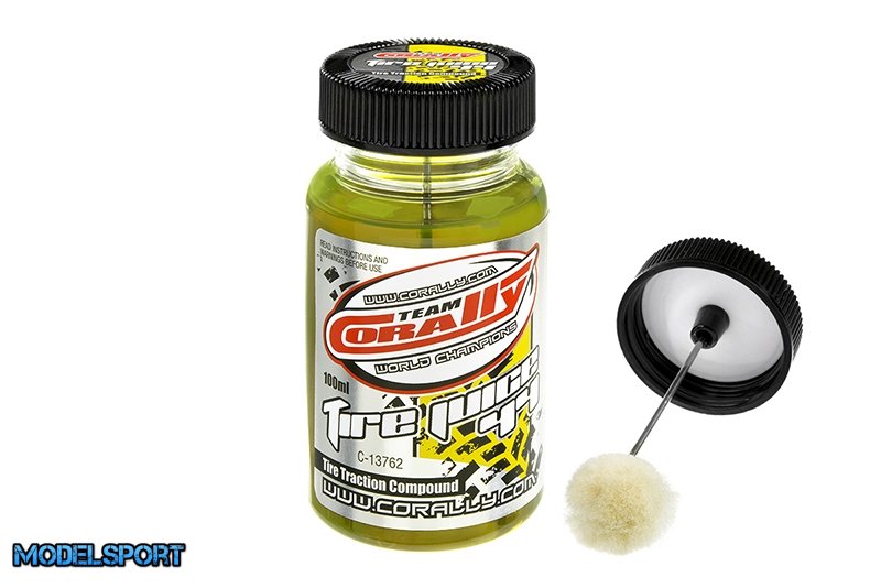 Team Corally TIRE JUICE er udviklet i samarbejde med verdensmestre og europæiske mestre for at give det højeste niveau af greb med hidtil usete niveauer af konsistens fra starten af ​​løbet til målstregen. Ved formuleringen af ​​TC TIRE JUICE blev der taget nøje hensyn til at forlænge dækkets levetid, og selvom TC TIRE JUICE giver den trækkraft, mestre kræver, hjælper det også med at reducere dækslid.