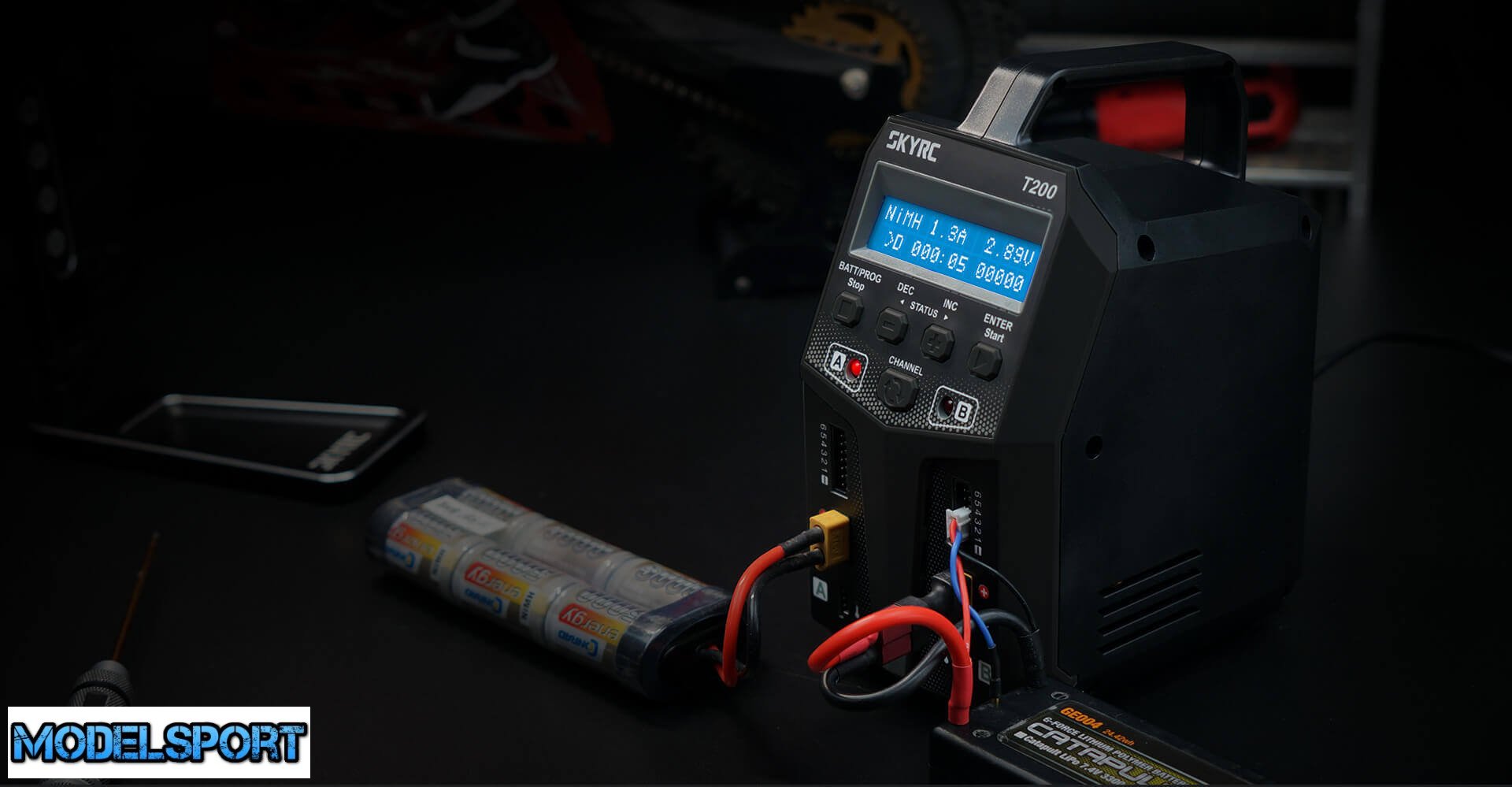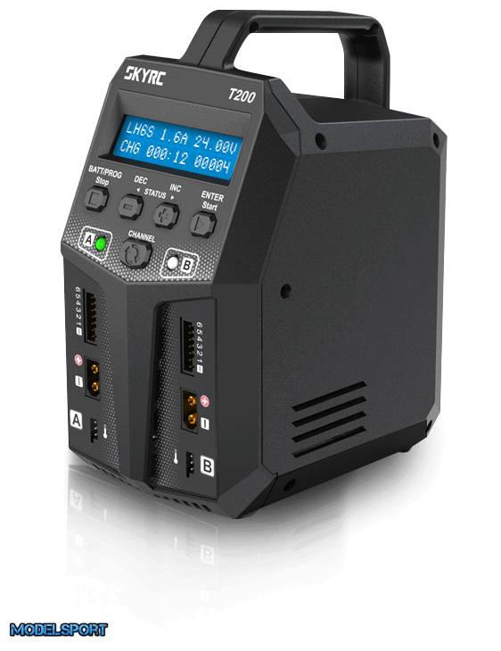 T200 kommer klar til opladning i det mest kompakte design endnu, mens den optager minimal plads i pit-området. Opladeren fylder kun lige så meget på bænken som et par batteripakker og leverer dedikeret 100W integreret strøm pr. hver af de to komplette opladningskredsløb. Inde i kabinettet er der transformerkraft nok til at fylde to batterier samtidigt med op til 12 ampere hver, så du kan pumpe liv i alt fra en modtagerpakke til en 6S LiPo eller 15S NiMH eller NiCD. Al den programmerbarhed, du forventer af en moderne oplader på højere niveau, er indbygget!