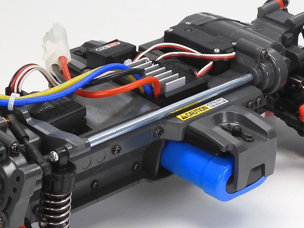 Baseret omkring en robust monocoque ramme med integrerede gearkasser giver dette kompakte 4WD chassis en spændende køretur, uanset om du tager den på vej eller flade jordoverflader. Den har en bagmonteret motor med gear drevne baghjul og en propelaksel, der tager kraften til fronten. Både for- og baggearkasser har differentialegear. Batteripakkens placering i chassisets centrum sikrer fremragende balance, mens 4-hjuls uafhængig dobbelt bærearms ophæng anvender friktionsdæmpere.